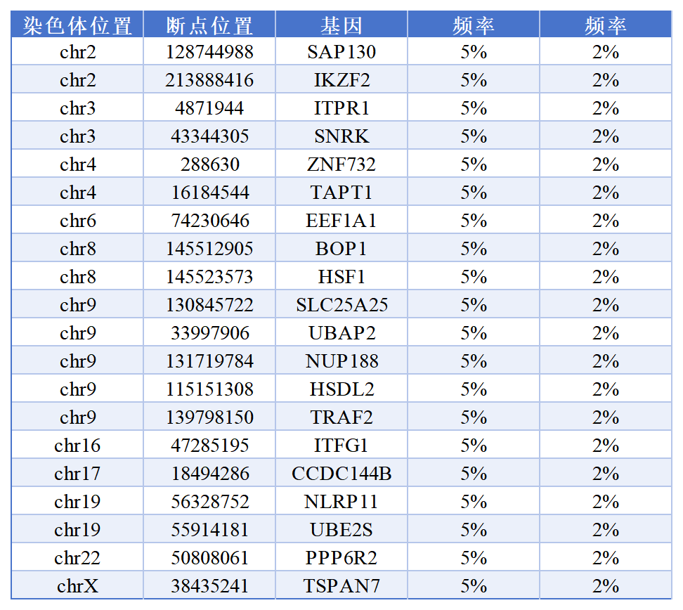 目前檢測ISA的方法有LM-PCR、NGS、單細胞測序等,為了保證檢測的準確性,科佰生物開發(fā)了一系列慢病毒整合位點標準品供檢測機構使用,作為品質衡量的標尺對檢測能力進行判別。在前文 慢病毒整合位點標準品強勢來襲一文中,已對單克隆多插入位點、單克隆單插入位點、性染色體插入位點 做了產品的說明及數據展示。近期科佰推出了5% 2% 整合頻率的慢病毒多克隆多整合位點參考品,由多個單克隆整合位點產品混合而來,覆蓋20個插入位點,分別來自11個不同染色體上的20個基因,如下表所示