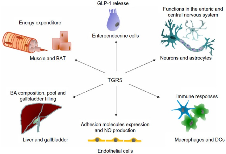 TGR5在多種細(xì)胞類(lèi)型中被研究,如肌肉細(xì)胞、脂肪細(xì)胞、內(nèi)皮細(xì)胞(ECs)和巨噬細(xì)胞。TGR5的功能依賴(lài)于細(xì)胞類(lèi)型,從胰高血糖素樣肽-1 (GLP-1)的釋放和線(xiàn)粒體能量穩(wěn)態(tài)到炎癥反應(yīng)的控制。