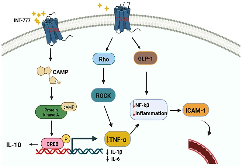 有報(bào)道稱(chēng),在慢性炎癥反應(yīng)中,TNF-α可激活多種半胱天冬酶,導(dǎo)致炎癥細(xì)胞凋亡。TGR5已被發(fā)現(xiàn)通過(guò)調(diào)節(jié)Rho/Rho相關(guān)蛋白激酶(ROCK)信號(hào)通路來(lái)調(diào)節(jié)TNF-α。作為T(mén)GR5的激動(dòng)劑,INT-777可以阻斷TNF-α誘導(dǎo)的RMEC增殖和遷移,抑制TNF-α促進(jìn)血管通透性的作用。此外,已有證據(jù)表明,TGR5激動(dòng)劑可以通過(guò)激活TGR5- camp蛋白激酶A (PKA)信號(hào)通路,上調(diào)IL-10的表達(dá),發(fā)揮抗炎和免疫抑制作用,降低促炎細(xì)胞因子IL-1β、IL-6和TNF-α的表達(dá)。有研究表明,GLP-1可通過(guò)抑制NF-κB延緩ECs的損傷,進(jìn)而抑制IL-1β、IL-6、TNF-α等炎癥因子的分泌。而各種研究證實(shí)GLP-1是TGR5的靶點(diǎn)之一;其分泌依賴(lài)于TGR5。因此,推測(cè)激活TGR5可能是刺激GLP-1分泌、延緩RMEC損傷的有效途徑。