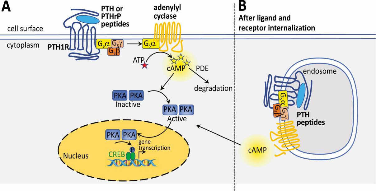 PTH1R的核心結(jié)構(gòu)包括N端胞外結(jié)構(gòu)域(ECD)、7次跨膜結(jié)構(gòu)域(7TMD,由七個跨膜α螺旋和連接環(huán)組成)和C端胞內(nèi)結(jié)構(gòu)域。PTH 或 PTHrP 的氨基末端肽與PTH1R的ECD結(jié)合后,會導(dǎo)致 G 蛋白的激活,主要是 Gα,它激活腺苷酸環(huán)化酶,并以磷酸二酯酶限制的方式催化 cAMP 的產(chǎn)生。當(dāng)達(dá)到足夠的局部細(xì)胞內(nèi)濃度時,cAMP 激活 PKA,PKA 易位到細(xì)胞核,在核內(nèi)磷酸化 CREB,從而能夠在特定基因上轉(zhuǎn)錄 cAMP 響應(yīng)元件,從而調(diào)控成骨細(xì)胞分化和鈣磷代謝。PTH1R 信號傳導(dǎo)可以發(fā)生在細(xì)胞表面,或者對于 PTH 氨基末端肽,它也可以發(fā)生在配體和受體內(nèi)化后。