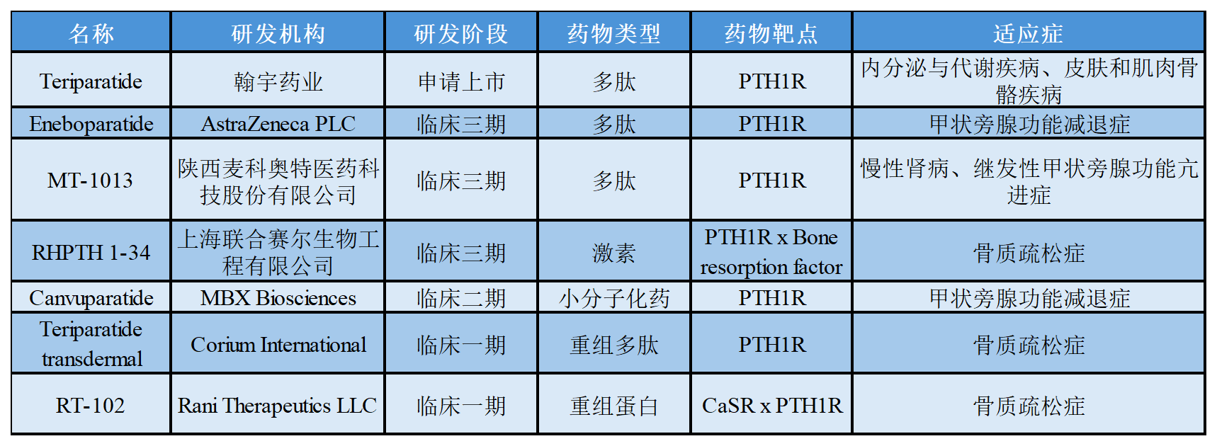 關(guān)于PTH1R在研的部分藥物進展如下表所示: