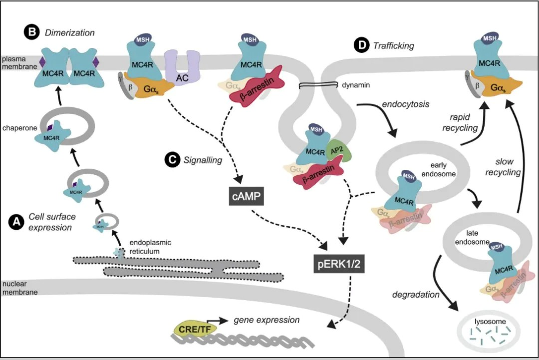 MC4R (黑皮質(zhì)素4受體) 是黑皮質(zhì)素受體家族成員之一,其家族屬于視紫紅質(zhì)樣A類GPCR,成員還包括:MC1R、MC2R、MC3R和MC5R。黑皮質(zhì)素受體 (MC1R-MC5R) 位于多種細(xì)胞類型上,并遍布大多數(shù)身體系統(tǒng)。MC4R是中樞黑皮質(zhì)素系統(tǒng)的重要組成部分,主要在下丘腦室旁核(PVH)中表達(dá),是一種A類GPCR。在高能量平衡狀態(tài)下,阿片黑皮質(zhì)素原 (POMC) 神經(jīng)元釋放多肽MC4R激動(dòng)劑-α-黑素細(xì)胞刺激激素(α-MSH)。α- MSH與MC4R結(jié)合會(huì)激活MC4R信號(hào)傳導(dǎo),抑制食欲和食物攝入。在低能量平衡狀態(tài)下,下丘腦室旁核中釋放AgRP (agouti-related peptide)。AgRP作為MC4R與α- MSH結(jié)合的競(jìng)爭(zhēng)性拮抗劑,也是MC4R反向激動(dòng)劑,抑制MC4R信號(hào)傳導(dǎo)。