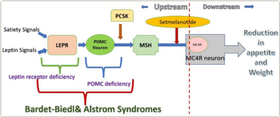 當(dāng)外周給藥時(shí),Setmelanotide可以穿透血腦屏障,作用于下丘腦的室旁核和下丘腦外側(cè)區(qū),這兩個(gè)與食欲調(diào)節(jié)相關(guān)的區(qū)域。通過(guò)與 MC4R 結(jié)合,它填補(bǔ)了下丘腦瘦素 - 黑皮質(zhì)素通路中缺失的一環(huán),從而抑制食欲并改善胰島素抵抗。它還能通過(guò)將底物氧化轉(zhuǎn)向脂肪,從而提高靜息能量消耗。