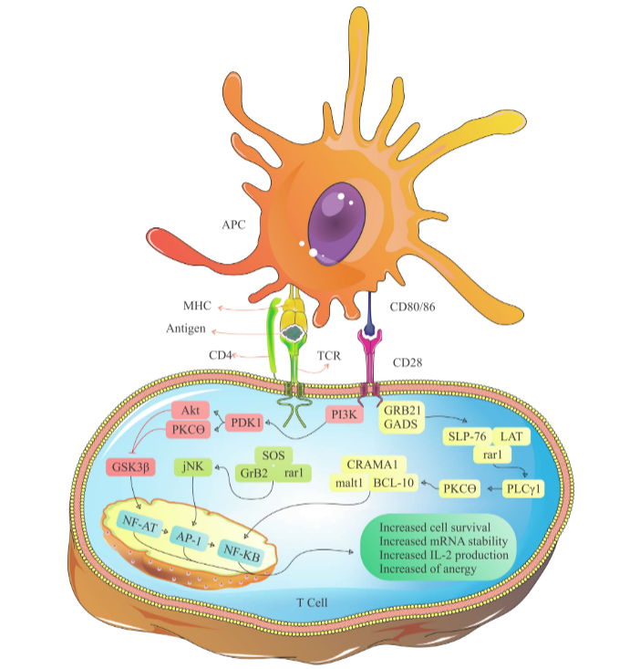 CTLA-4是由CTLA-4基因編碼的一種重要的跨膜蛋白。該蛋白屬于免疫球蛋白超家族(Immunoglobulin Superfamily, IgSF)成員,其結(jié)構(gòu)包括一個(gè)胞外免疫球蛋白可變區(qū)(IgV)結(jié)構(gòu)域、一個(gè)跨膜區(qū)以及一個(gè)胞內(nèi)結(jié)構(gòu)域。CTLA4與T細(xì)胞共刺激蛋白CD28同源,并且兩種分子在抗原呈遞細(xì)胞上分別與CD80和CD86(也稱為B7-1和B7-2)結(jié)合。CTLA-4以比CD28更大的親和力和親合力結(jié)合CD80和CD86,因此使其能夠勝過CD28的配體。CTLA4向T細(xì)胞傳遞抑制信號,而CD28傳遞刺激信號。CTLA4也在調(diào)節(jié)性T細(xì)胞(Tregs)中發(fā)現(xiàn)并有助于它們的抑制功能。通過T細(xì)胞受體和CD28的T細(xì)胞活化導(dǎo)致CTLA-4的表達(dá)增加。