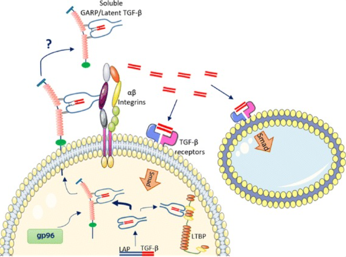 LTGF-β 是前體 TGF-β(pro-TGF-β)與潛伏相關(guān)肽(LAP)形成的復(fù)合物,TGF-β以無活性的同源二聚體前體蛋白形式合成,經(jīng)由類似于弗林蛋白酶的蛋白酶切割后形成LTGF-β 。GARP 能增強弗林蛋白酶依賴性切割,并與LTGF-β 結(jié)合。內(nèi)質(zhì)網(wǎng)腔內(nèi)的主要伴侶蛋白 gp96 確保 GARP 的正確折疊及其在細(xì)胞表面的表達。在細(xì)胞表面,GARP/LTGF-β復(fù)合物與α-β整合素(αVβ6 和αVβ8)結(jié)合,釋放成熟的 TGF-β 肽。成熟的 TGF-β 以自分泌和旁分泌的方式與細(xì)胞表面的 TGF-β 受體相互作用。在某些情況下,GARP/LTGF-β復(fù)合物也可以從細(xì)胞表面釋放,但如何從可溶性復(fù)合物中激活 TGF-β 尚不清楚。