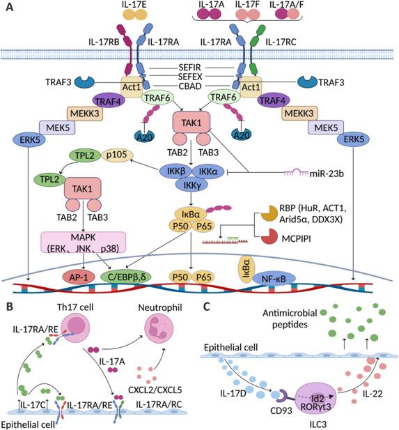 IL-17 細(xì)胞因子具有一個(gè)半胱氨酸環(huán)結(jié)構(gòu),它們會(huì)與特定的 IL-17R 受體結(jié)合,通過 SEFIR、SEFEX 和 CBAD 結(jié)構(gòu)域激活免疫信號(hào)傳導(dǎo)。IL-17 信號(hào)傳導(dǎo)始于 IL-17A/A、IL-17A/F 或 IL-17F/F 細(xì)胞因子與其受體(IL-17RA 和 IL-17RC)的結(jié)合,或者 IL-17E/E 細(xì)胞因子與其受體(IL-17RA 和 IL-17RB)的結(jié)合。當(dāng)配體結(jié)合后,Act1 會(huì)激活多種獨(dú)立的信號(hào)傳導(dǎo)途徑,這些途徑通過不同的 TRAF 蛋白介導(dǎo)。TRAF6 的激活會(huì)導(dǎo)致 NF-κB、C/EBPβ、C/EBPδ 和 MAPK 信號(hào)通路的觸發(fā)。IL-17R-Act1 復(fù)合物還通過 TRAF4 與 MEKK3 和 MEK5 結(jié)合,從而激活 ERK5。不同類別的抑制劑,如泛素酶(TRAF3)、去泛素酶(A20)、RBP(HuR、ACT1、Aridα 和 DDX3X)、內(nèi)切核糖核酸酶(MCPIP1/Regnase-1)和微小 RNA(miR-23b),通過各種獨(dú)立的機(jī)制負(fù)向調(diào)節(jié) IL-17 信號(hào)傳導(dǎo)。IL-17C 主要由上皮細(xì)胞表達(dá)。當(dāng) IL-17RA/RE 受體復(fù)合物表達(dá)時(shí),上皮細(xì)胞本身和 TH17 細(xì)胞都是 IL-17C 的作用靶點(diǎn)。除了增加 Th17 細(xì)胞中 IL17A 的表達(dá)外,IL-17C 還通過間接方式增強(qiáng)吸引中性粒細(xì)胞的趨化因子在上皮細(xì)胞中的表達(dá),最終導(dǎo)致強(qiáng)烈的炎癥反應(yīng)。