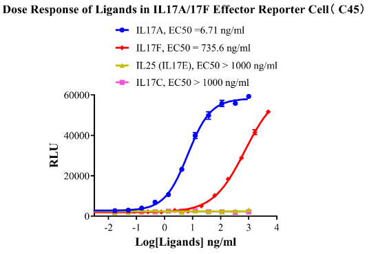 為了助力IL17相關(guān)靶點(diǎn)藥物的研發(fā),科佰生物分別開發(fā)了針對IL17A/F和IL25的細(xì)胞模型,用于候選藥物早期機(jī)理研究。部分結(jié)果如下: