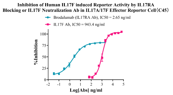 Figure 5. Inhibition of Human IL17F induced Reporter Activity by IL17RA Blocking or IL17F Neutralization Ab in IL17A/17F Effector Reporter Cell (C45).
