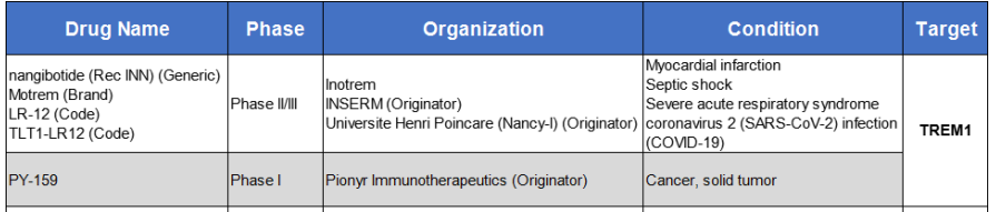 TREM1作為一個(gè)新靶點(diǎn),全球范圍內(nèi)披露的研發(fā)管線不多,針對(duì)TREM1靶點(diǎn)有2款產(chǎn)品進(jìn)入臨床,1款產(chǎn)品即將進(jìn)入臨床(Celsius公司的CEL383,適應(yīng)癥為炎癥性腸?。_m應(yīng)癥主要為急性感染性疾病、自身免疫性疾病和癌癥。目前TREM1靶點(diǎn)針對(duì)癌癥的臨床前藥物比較活躍的是nangibotide(處于臨床II/III期)及PY-159(處于臨床I期)。其中較引人關(guān)注的是Pionyr Immunotherapeutics公司的TREM1抗體PY159正在與帕博利珠單抗聯(lián)合用于晚期實(shí)體瘤患者的Ia/Ib期研究。PY159 是一種人源化單克隆抗體,能特異性地結(jié)合表達(dá)在髓系細(xì)胞上的TREM1,并通過(guò)交聯(lián)TREM1/DAP12 復(fù)合物誘導(dǎo)下游信號(hào)傳導(dǎo),發(fā)揮激動(dòng)劑的作用。2023年 ASCO報(bào)道的 PY159 的用于冷腫瘤相關(guān)瘤種的I期的臨床研究,結(jié)果顯示總體安全性可控,療效方面 ORR 為 6%,DCR 為 33%,其中胰腺癌患者展現(xiàn)出較好的療效。總的來(lái)說(shuō),TREM1靶點(diǎn)藥物的作用機(jī)理和效果還不是非常明確,正在研發(fā)的藥物療效也不是很出色,未來(lái)前景還值得繼續(xù)觀察。