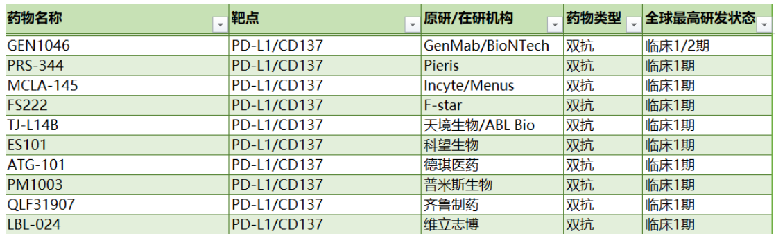 由于4-1BB在高度耗竭的PD-1高表達CD8+TIL上顯著表達,并且在PD-1阻斷后進一步上調(diào),而4-1BB信號傳導則會誘導CD8+TIL的克隆擴增,CD8+TIL表現(xiàn)出腫瘤反應性而無終末分化,因此4-1BB和PD-L1可能是誘導T細胞抗腫瘤反應機制上的一對好搭檔。針對這兩者開發(fā)雙特異性抗體是一種極具前景的開發(fā)策略,引得國內(nèi)外玩家紛紛參與,目前已有十余款針對PD-L1/4-1BB的雙抗藥物處于不同的研發(fā)介段,下表列舉了部分已進入臨床的雙抗藥物: