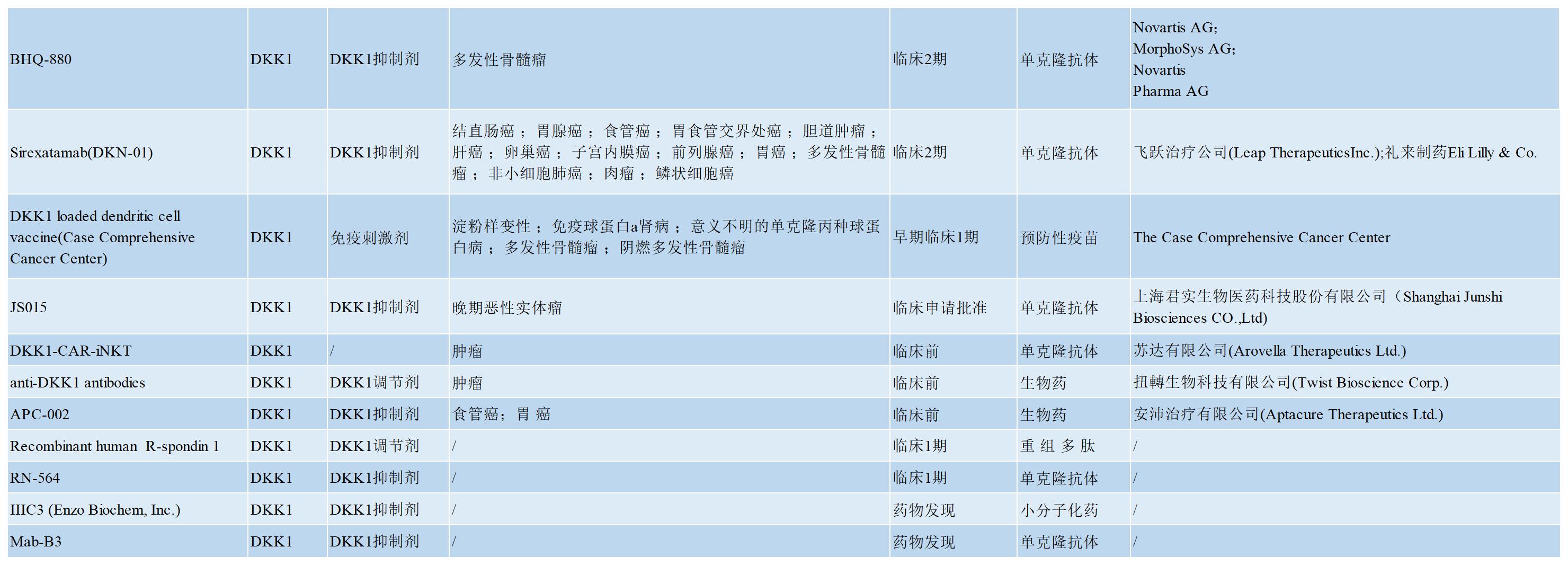 DKK1具有調(diào)節(jié)免疫的特性,它對免疫系統(tǒng)的抑制作用使其成為免疫治療的一個(gè)有前景的靶點(diǎn)。此前,Leap Therapeutics開發(fā)了抗DKK1中和抗體DKN-01并在晚期胃食管交界處和胃癌癥(GEJ/GC)以及婦科癌癥的I期或II期試驗(yàn)中進(jìn)行了評(píng)估,其方案包括與紫杉醇或pembrolizumab的單藥治療和聯(lián)合治療比較,值得注意的是,患有Wnt信號(hào)突變的婦科癌癥患者可以從DKN-01治療中獲益。GEJ/GC的另一項(xiàng)正在進(jìn)行的臨床研究也表明,在腫瘤表達(dá)高水平DKK1(DKK1高)的患者中生存率和客觀反應(yīng)結(jié)果都有所提高;非常令人鼓舞的結(jié)果表明,DKN-01加Keytruda治療可使中位無進(jìn)展生存期(PFS)超過22周,中位總生存期(OS)接近32周,在既往未接受抗PD-1/PD-L1治療的DKK1高GEJ/GC患者中,ORR為50%,疾病控制率(DCR)為80%;在對PD-1/PD-L1治療難治的6名GEJ/GC患者中,3名血清DKK1水平高的患者病情穩(wěn)定,而3名血清DKK1水平低的患者病情則發(fā)生進(jìn)展。這些結(jié)果表明,DKK1抑制治療顯著改善了血清DKK1水平高的患者的療效,并由此得出在DKK1高表達(dá)腫瘤患者中使用DKK1抑制劑和PD1/PDL-1免疫檢查點(diǎn)聯(lián)合治療的方案是一種獲得更好療效的策略。目前已有多個(gè)DKK1抑制劑處于研發(fā)階段,其中多數(shù)為DKK1的中和抗體,也有少量的小分子及重組多肽,小核酸藥物等( 如下表所示)。