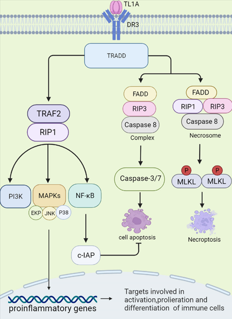 在靜息的T細(xì)胞中,DR3以可溶性形式表達(dá),保護(hù)細(xì)胞免于凋亡。活化的T細(xì)胞表達(dá)跨膜DR3。sTL1A結(jié)合DR3 (膜結(jié)合形式)激活下游信號(hào)級(jí)聯(lián),從而調(diào)節(jié)免疫反應(yīng)和炎癥。sTL1A/DR3相互作用可觸發(fā)兩種不同的信號(hào)通路,分別引起炎癥和細(xì)胞凋亡。首先,DR3的死亡結(jié)構(gòu)域與細(xì)胞質(zhì)中的適配蛋白TNFR相關(guān)死亡結(jié)構(gòu)域蛋白(TRADD)結(jié)合,然后招募TNFR相關(guān)因子2 (TRAF2)和受體相互作用蛋白1 (RIP1)。這些復(fù)合物激活MAPKs (ERK、p38和JNK)、NF-κB和效應(yīng)激酶PI3K信號(hào)傳導(dǎo)。最后,激活的信號(hào)傳導(dǎo)調(diào)節(jié)促炎基因的表達(dá),參與免疫相關(guān)疾病的發(fā)生。TRADD結(jié)合FAS相關(guān)死亡結(jié)構(gòu)域(FADD)和RIP3,激活半胱氨酸天冬氨酸特異性蛋白酶-8 (caspase-8)形成復(fù)合物,進(jìn)一步激活下游caspase通路(如caspase-3和-7),誘導(dǎo)凋亡細(xì)胞死亡。當(dāng)caspase-8活性被阻斷時(shí),F(xiàn)ADD、RIP3、RIP1與下游效應(yīng)分子混合譜系激酶結(jié)構(gòu)域樣蛋白(mixed lineage kinase domain-like protein, MLKL)在磷酸化后形成胞質(zhì)“壞死體”復(fù)合體。然后,MLKL寡聚到細(xì)胞膜上,導(dǎo)致壞死性細(xì)胞死亡,這是一種伴有強(qiáng)烈炎癥的細(xì)胞死亡形式。在這個(gè)過程中,NF-κB被證明可以誘導(dǎo)細(xì)胞凋亡抑制蛋白(c-IAP)的激活,從而介導(dǎo)細(xì)胞凋亡的負(fù)反饋調(diào)節(jié)和抑制。事實(shí)上,更多的證據(jù)表明,sTL1A與DR3的連接優(yōu)先誘導(dǎo)淋巴細(xì)胞的促炎途徑而不是凋亡。